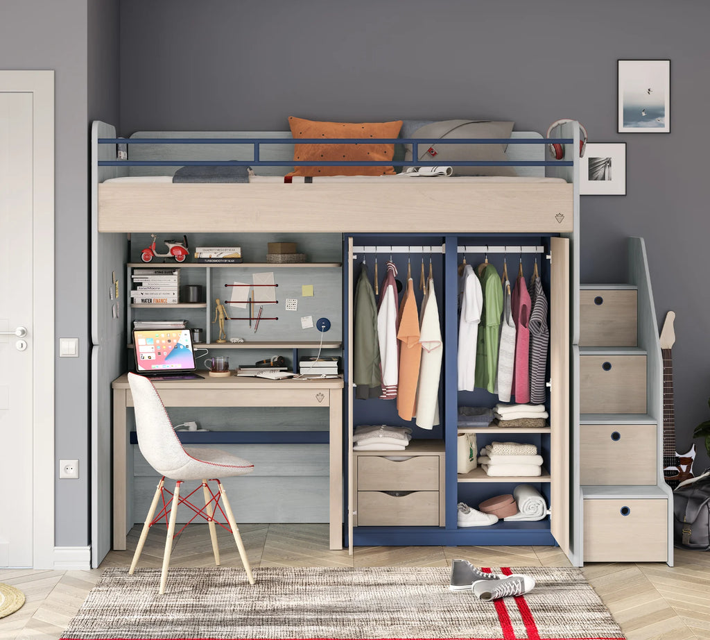 С ярките си сини и тъмносини цветове и дървесен вид, това бюро от колекцията Trio създава практично и естетически приятно работно пространство в стаята на тийнейджър.