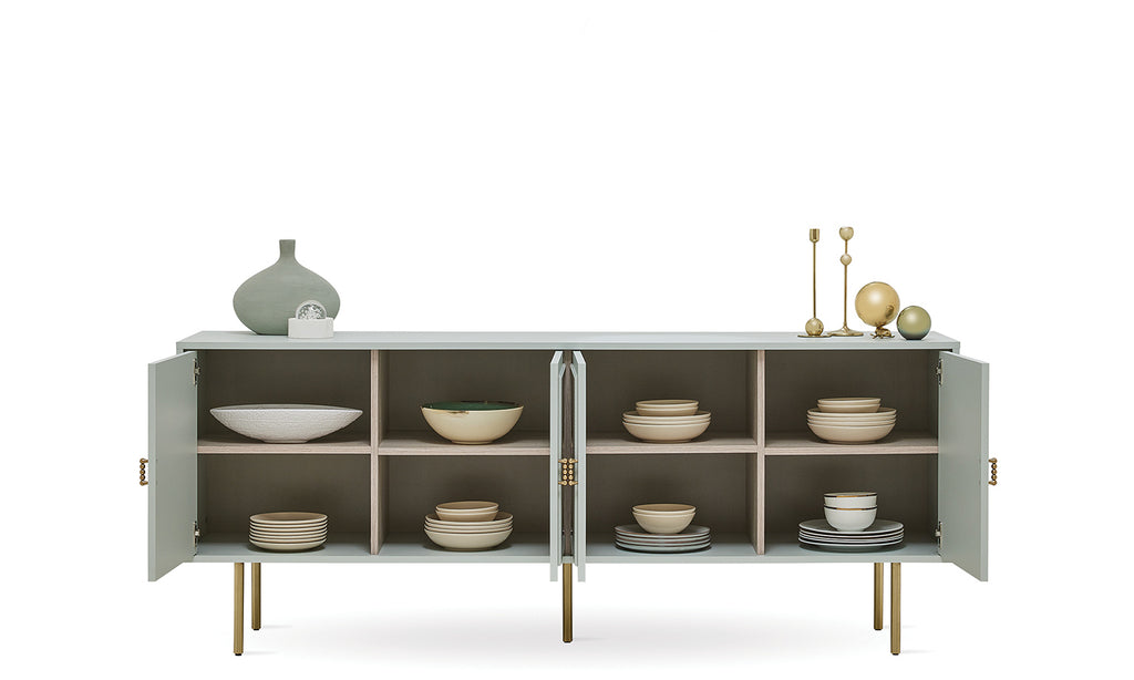 Серията Karlin, привлича вниманието с комбинацията от пастелно зелено, специален декор от камъни и детайли в златист цвят.
