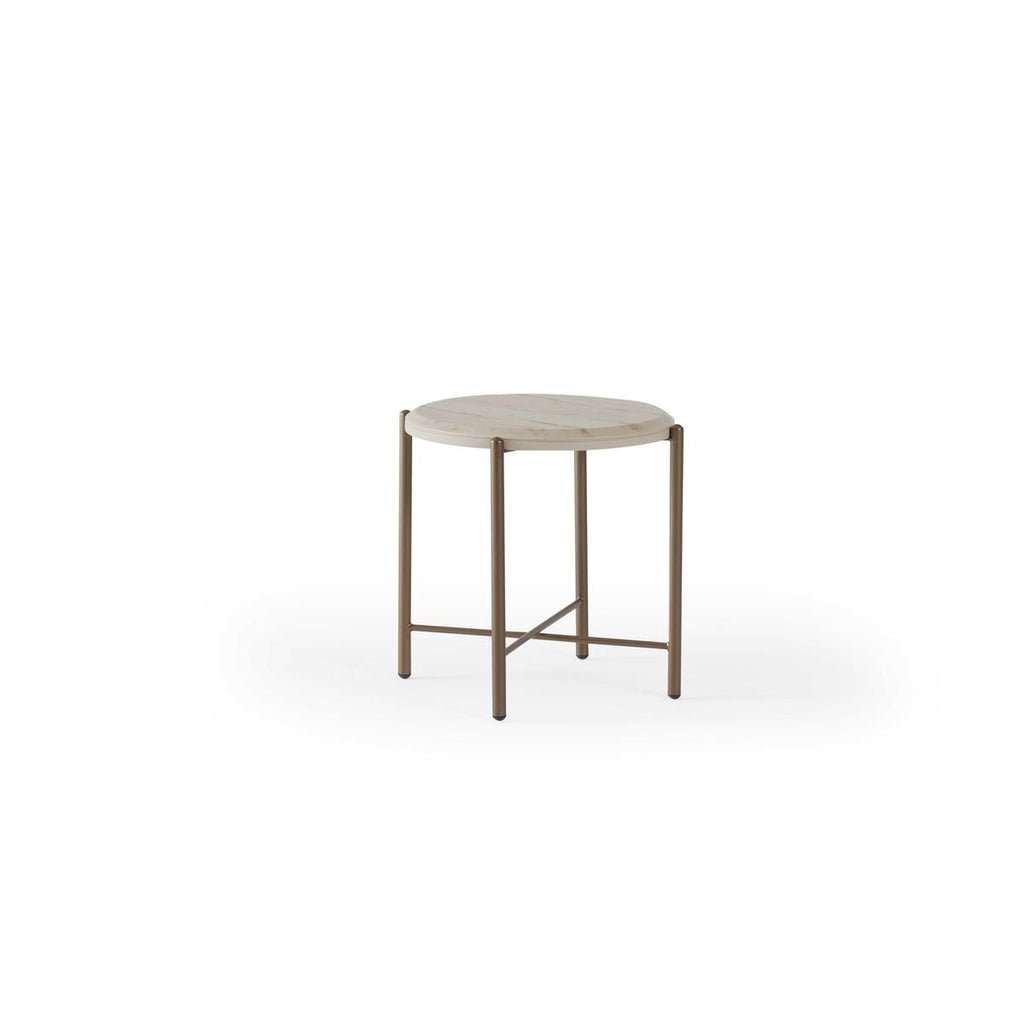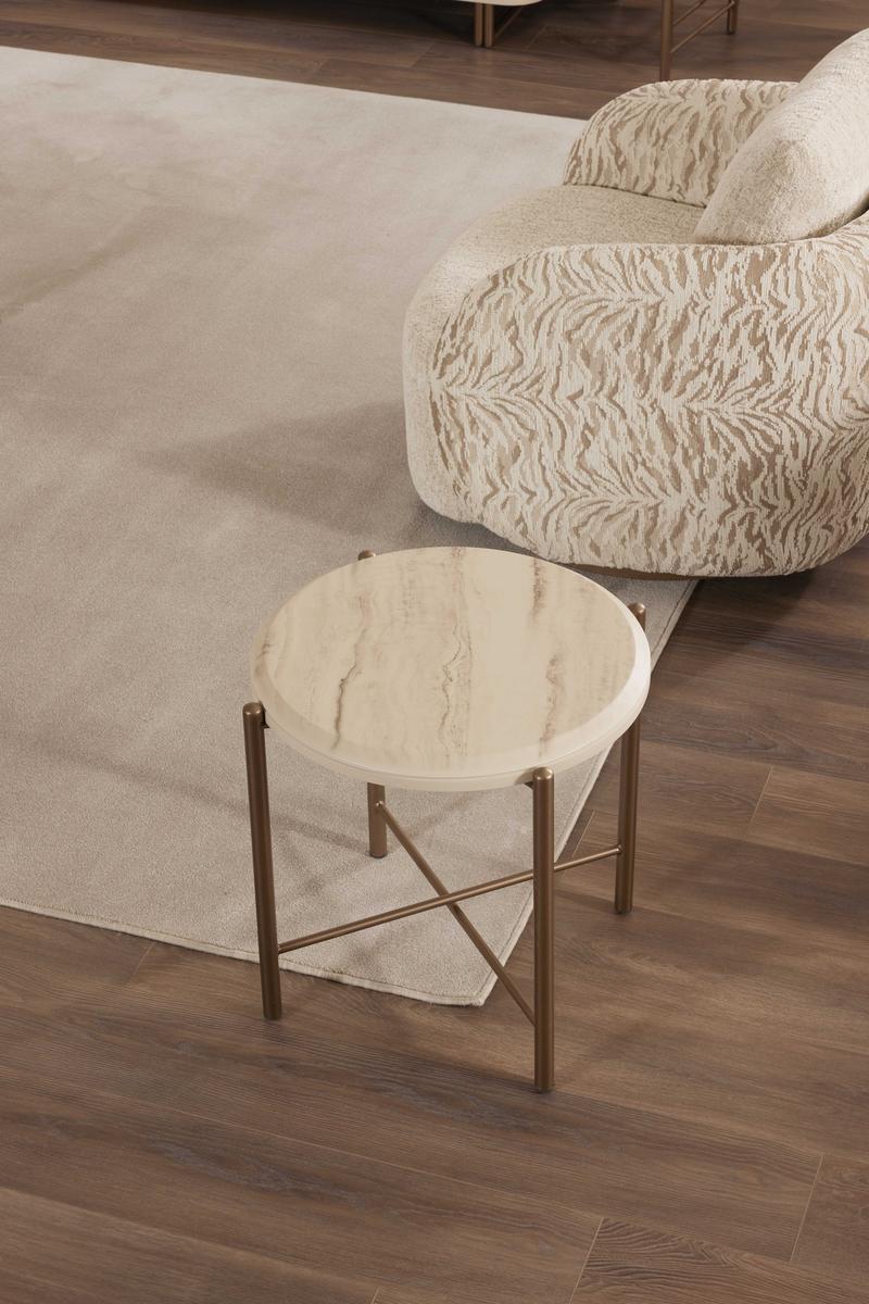 Стабилната метална основа и естествената текстура на плота я правят стилно и практично допълнение към всяка дневна.