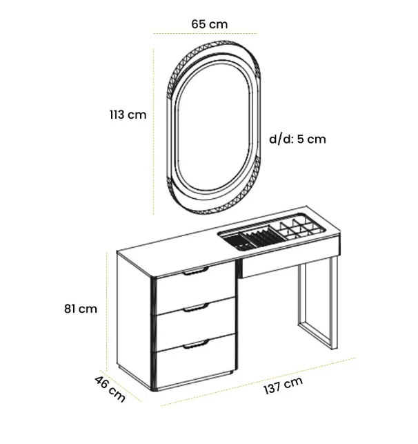 Тоалетката Bagdat е елегантно и практично допълнение към всяка модерна спалня. Съчетава стилна визия с отлична функционалност. Благодарение на трите си широки чекмеджета, осигурява достатъчно пространство за съхранение на козметика, бижута и лични принадлежности. Широкото огледало с изчистен дизайн придава усещане за простор и светлина, а топлите дървесни тонове създават уютна атмосфера.