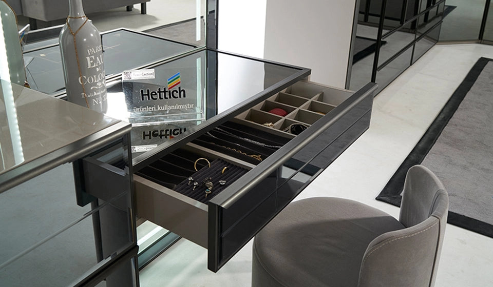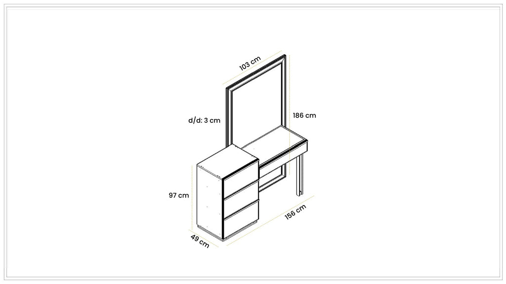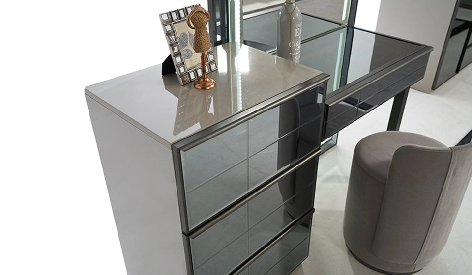 Тоалетка Oylat с огледало придава стил и изящество на спалнята с впечатляващите си детайли на чекмеджетата и огледалото.