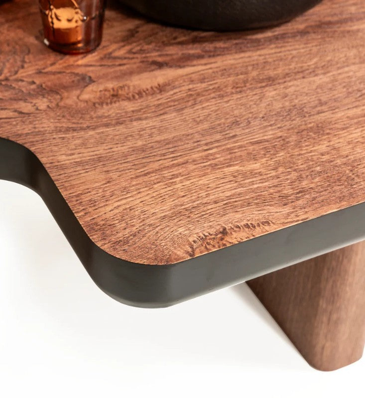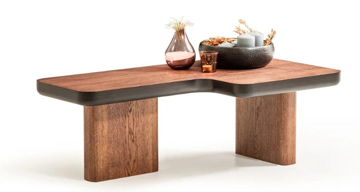 Neva 1379‑01 е модерна холна маса, която съчетава артистична форма и функционалност. Нейният L-образен плот с фурнир в орехов тон създава уникален визуален почерк, подчертан от черни акценти по ръбовете. Масата може да бъде използвана самостоятелно като дизайнерски акцент или комбинирана с втора, като двете се съединяват органично в по-голяма повърхност – интелигентно и гъвкаво решение.