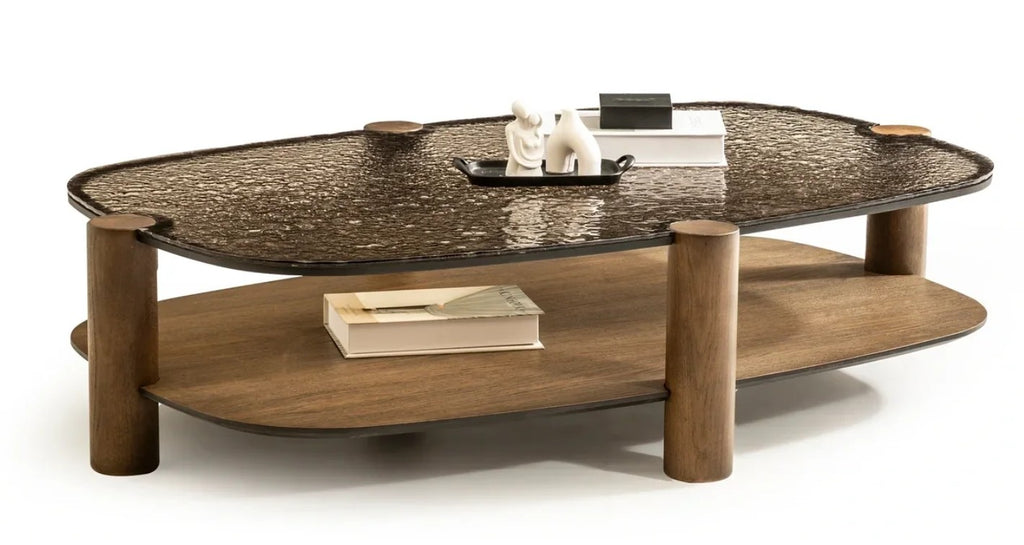 Хармония между „вода“ и „дърво“. Tigris отразява течението на река и щрихите на капките, вградени в бронзовия фюжън стъклен плот, поддържан от корпус с топла, износена дървесна текстура.
