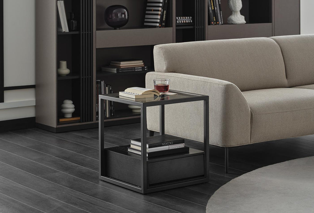 Отличава с оригинална и съвременна дизайнерска линия, внася модерен щрих в жилищните пространства със своята квадратна форма и стъклената повърхност, придружена от многофункционално чекмедже.